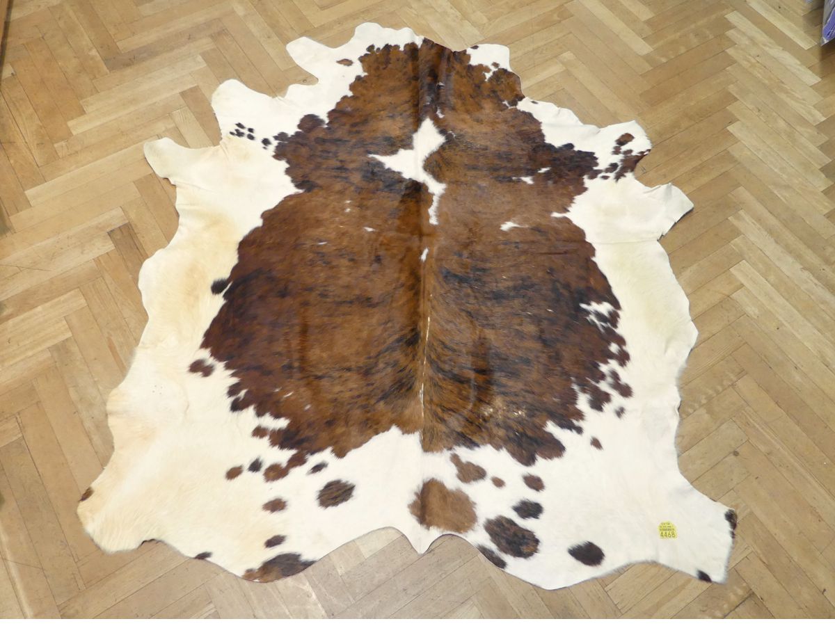Das Kuhfell ist dreifarbig, in braun- / rot mit schwarten streifen