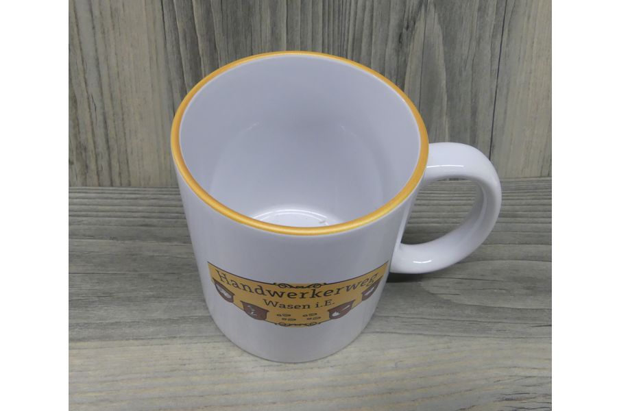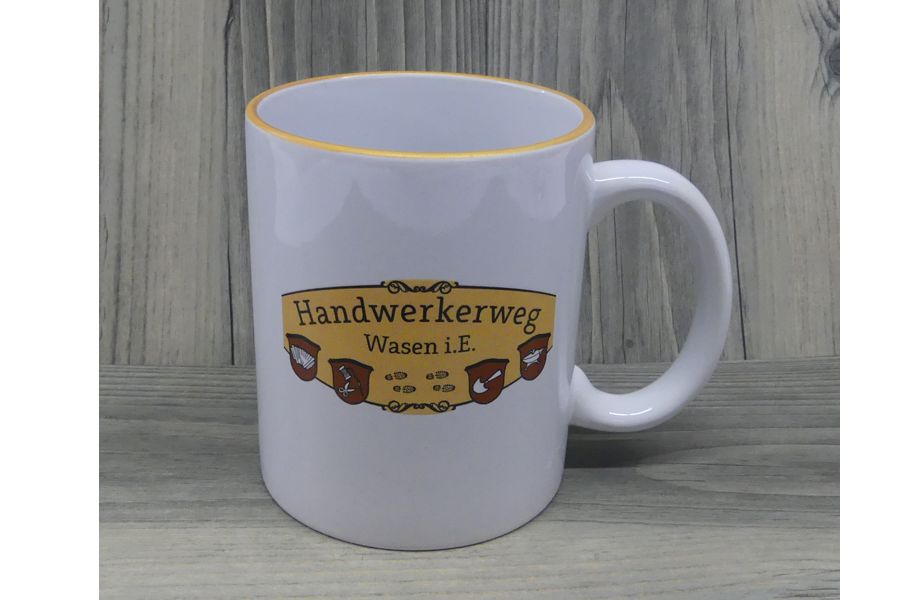 Mugbecher weiss mit Goldrand 33 cl mit Logo Handwerkerweg