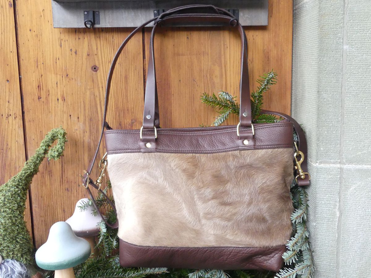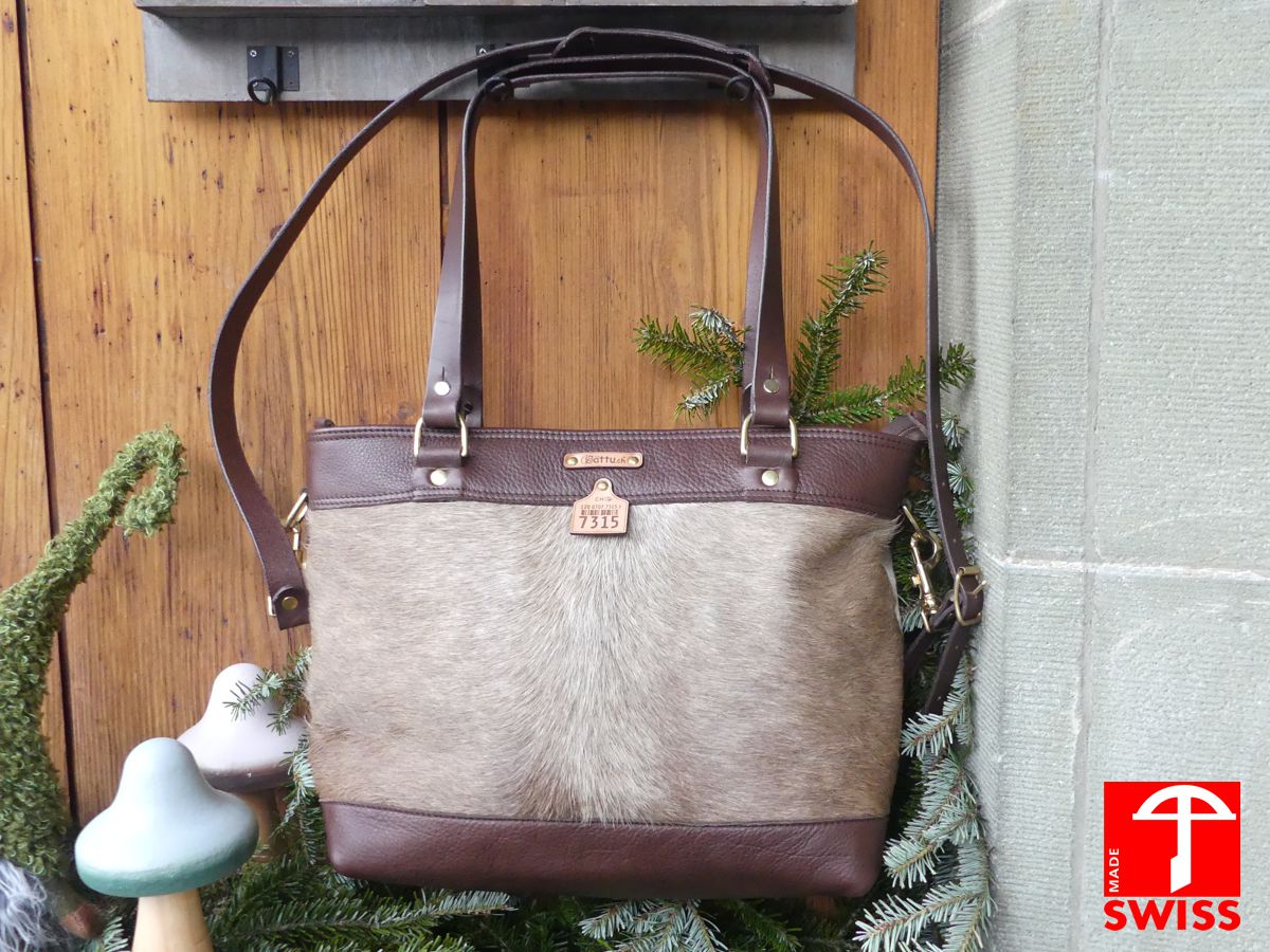 Die Edle, geräumige Tasche aus schweizer Kuhfell. Zu jeder Tasche können wir Ihnen die Geschichte der Kuh, des Rindes oder des Stiers erzählen.