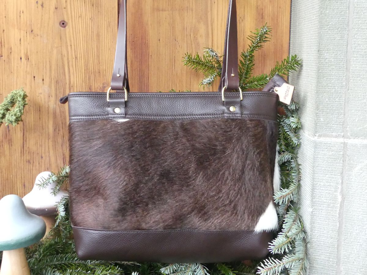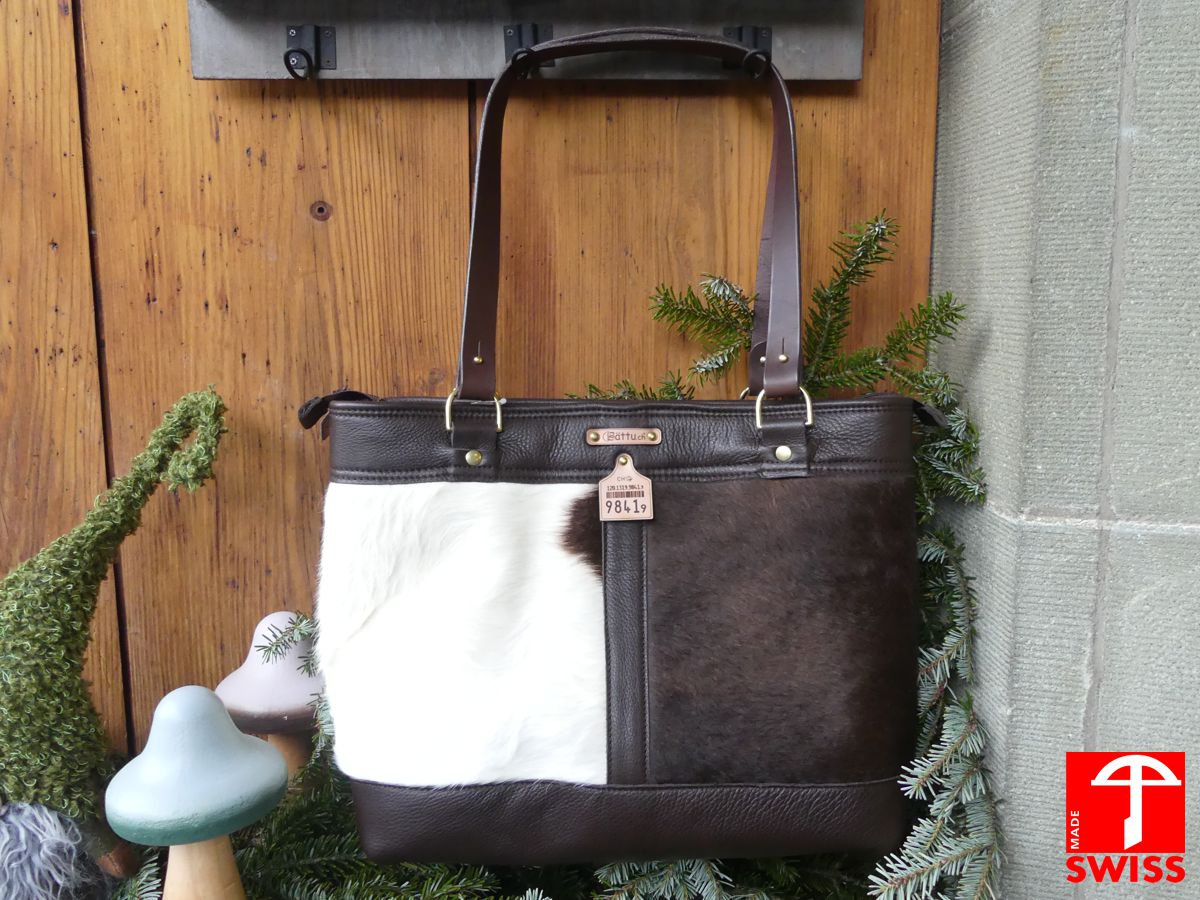 Die Edle, geräumige Tasche aus schweizer Kuhfell. Zu jeder Tasche können wir Ihnen die Geschichte der Kuh, des Rindes oder des Stiers erzählen.
