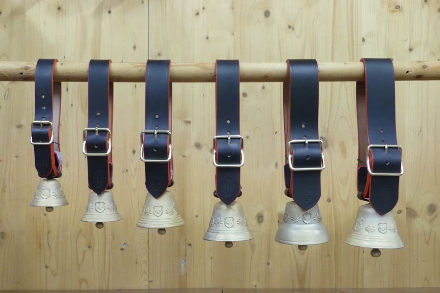 Glocke Nr 6.5:            Durchmesser 6.5 cm, Riemen 3 cm breit Schwarz mit Roter Kante, Schnalle Oro eingenietet