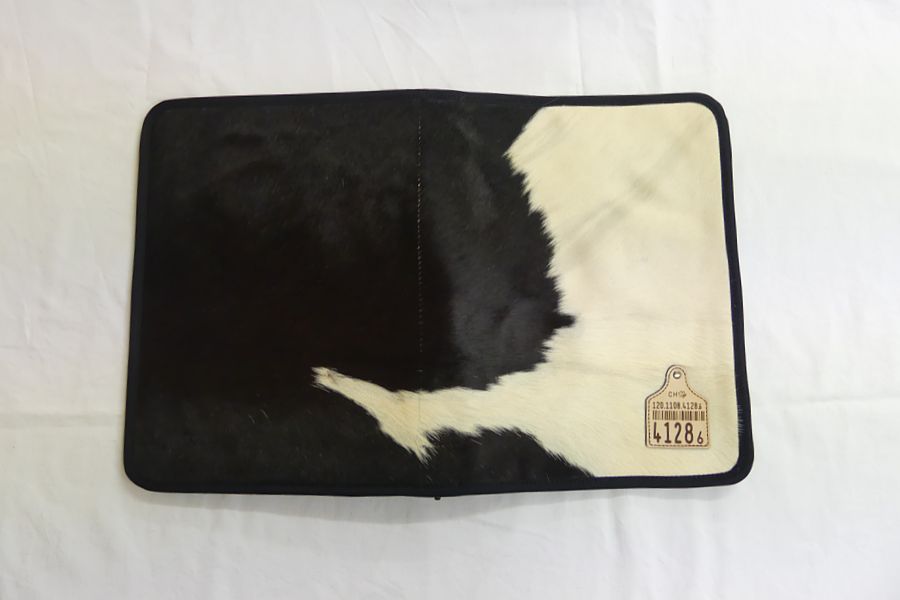 Der Deckel ist aus Schweizer Kuhfell, die nachgedruckte Ohrmarke aus Leder wird aufgenäht und verleiht der Mappe ihre Einzigartigkeit